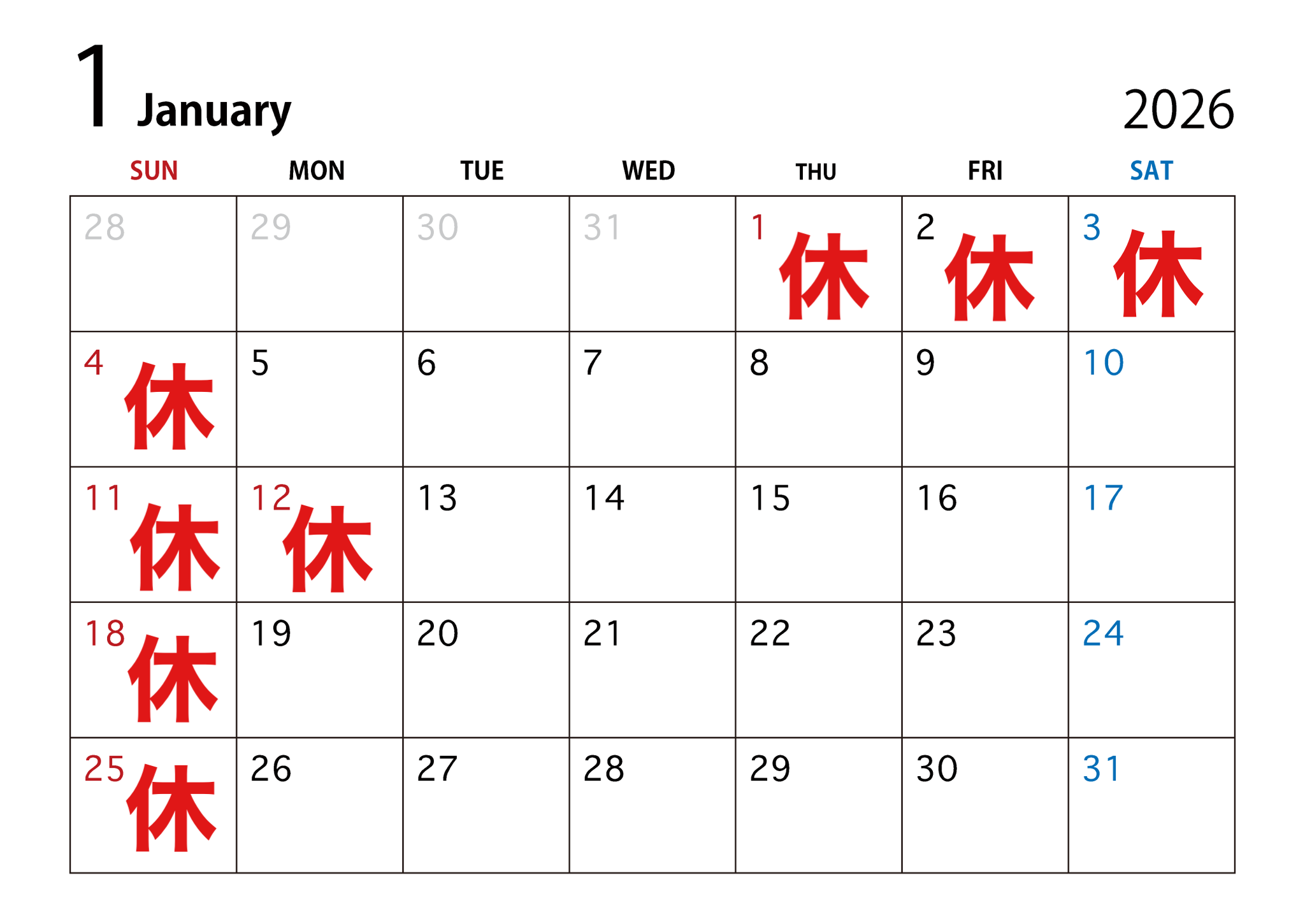 1月の営業日
